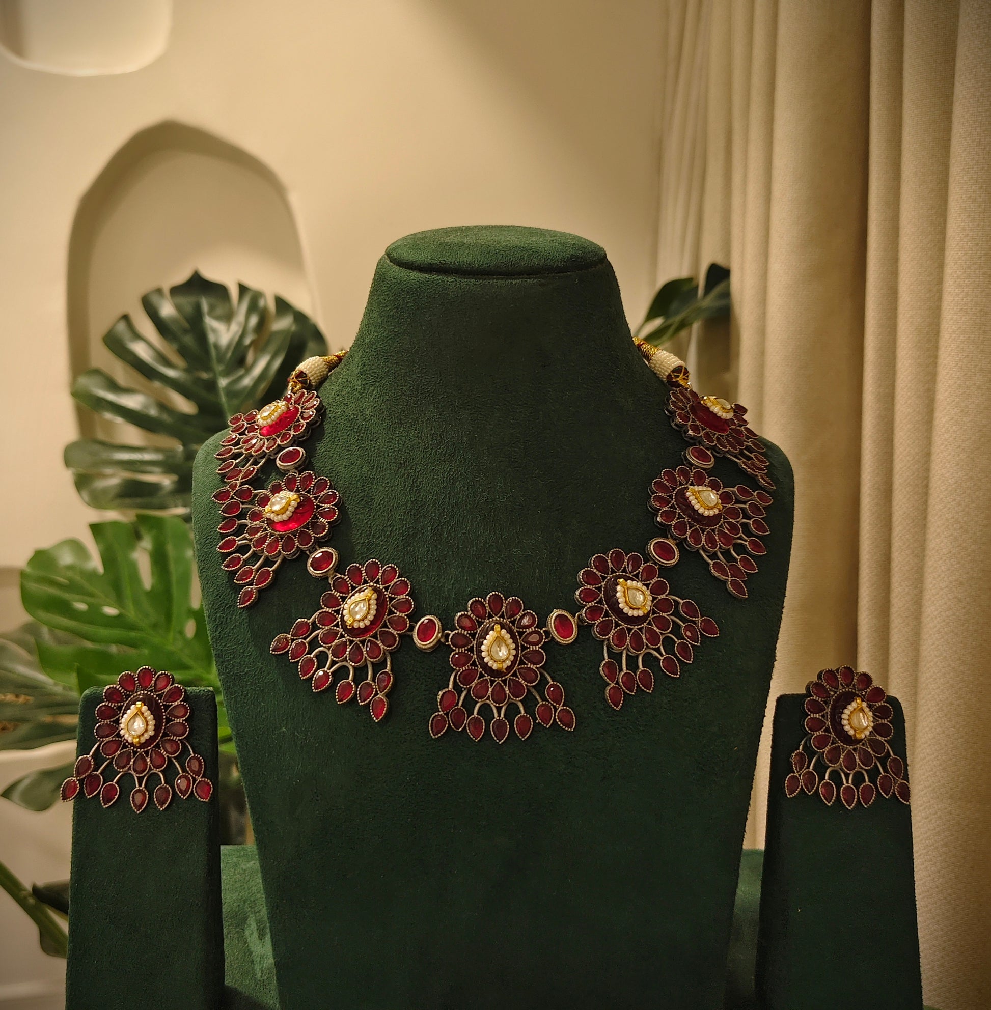 Beautiful Designer Stone Embedded Neckpiece With Kundan Detailing And Earrings