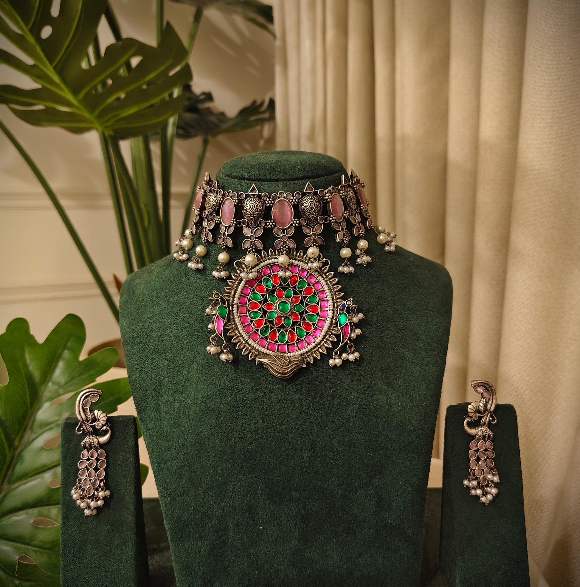 Beautiful Designer Stone Embedded Pendant Choker With Earrings